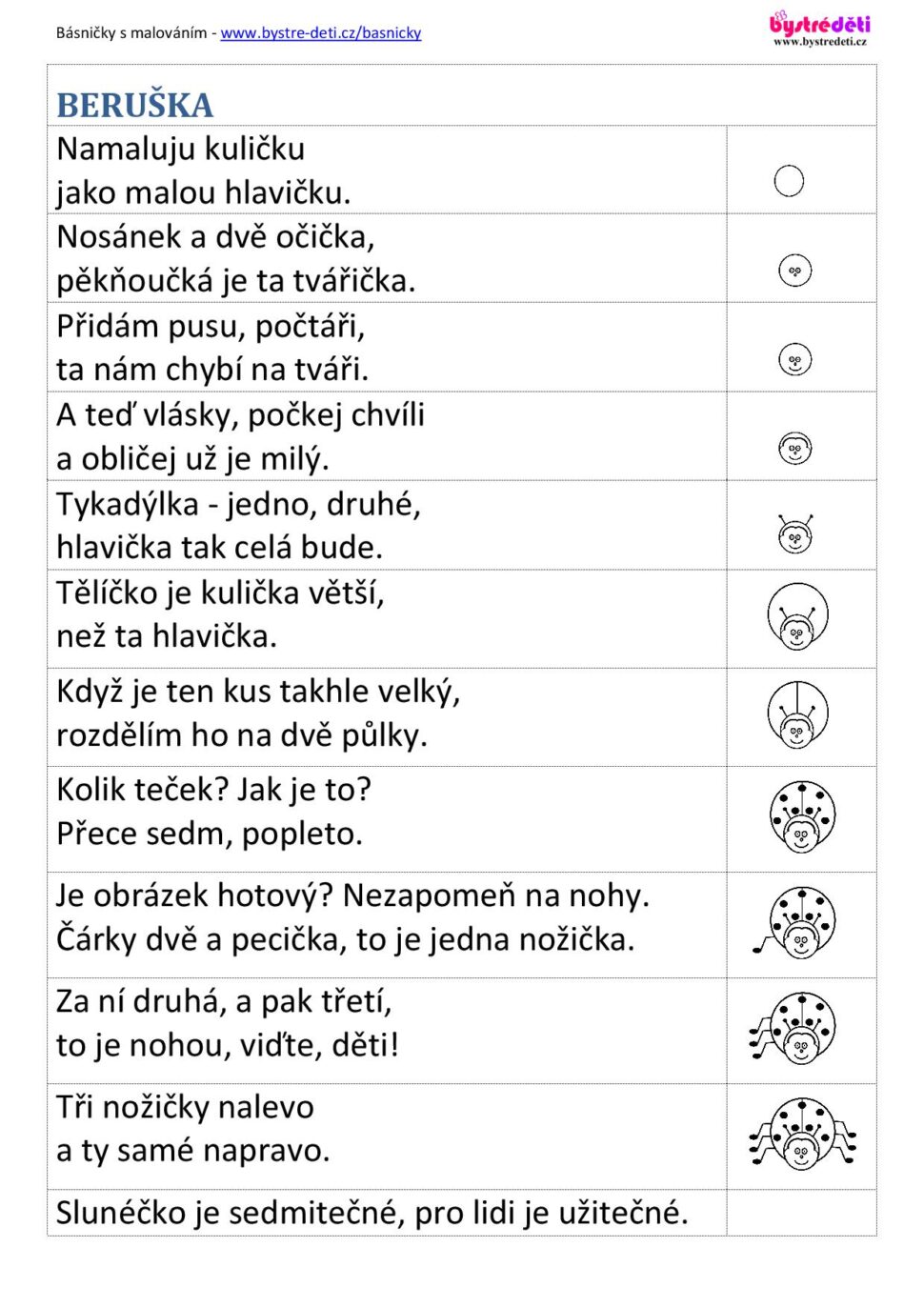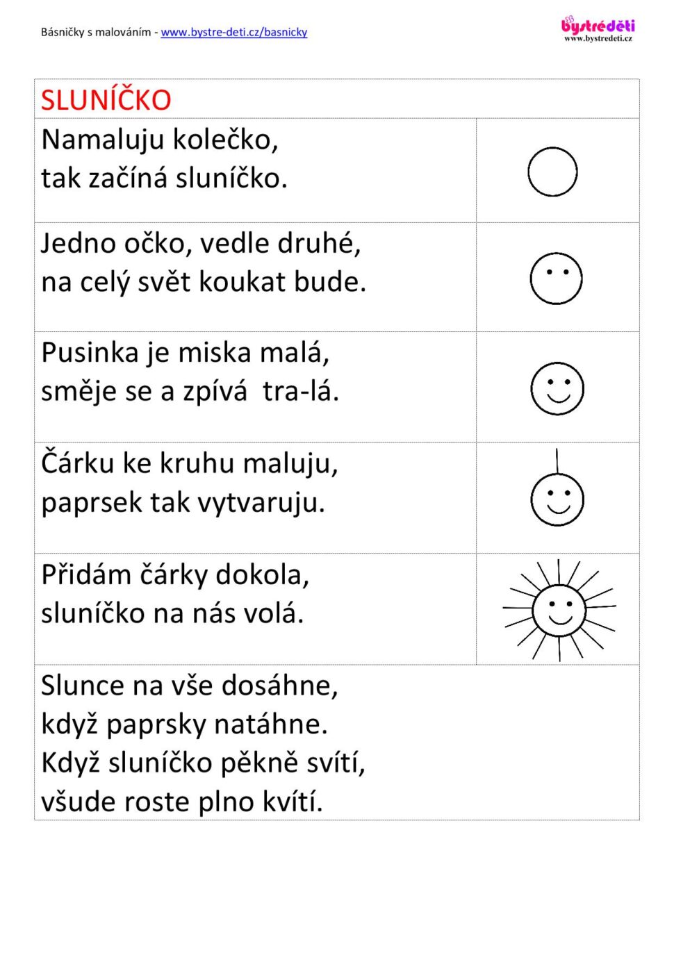 - TEXTOVÉ NÁVODY MALOVÁNÍ S OBRÁZKY PRO JEDNOTLIVÉ KROKY MALOVÁNÍPro lepší názornost si můžete básničku stáhnout (jpg) a vytisknout ve formě textového návodu krok za krokem, kdy zpravidla jednotlivým veršům básničky je přiřazen korespondující obrázek malování v daném kroku.