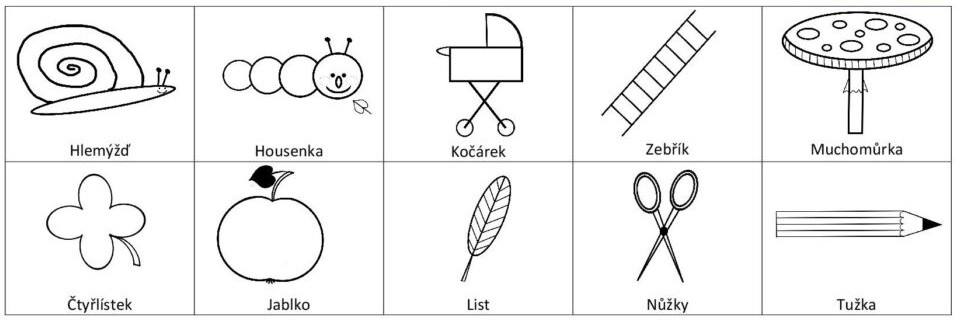 - Seznam básniček: hlemýžď, housenka, kočárek, žebřík, muchomůrka, čtyřlístek, jablko, list, nůžky, tužka