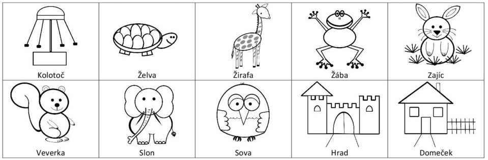 - Seznam básniček: kolotoč, želva, žirafa, žába, zajíc, veverka, slon, soba, hrad, domeček