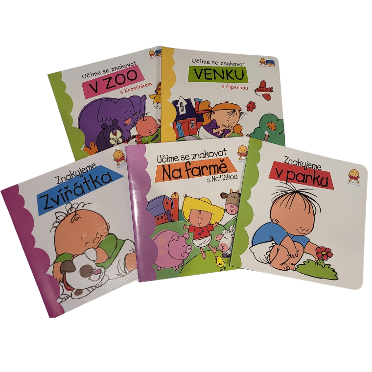 Sada 5 knížek pro miminka k výuce znakování. Každá knížka obsahuje celkem šest znaků: - Znakujeme v parku: míč, motýl, houpačka, klouzačka, květina, strom. - Učíme se znakovat venku s Čiperkou (leporelo): ven, letadlo, brouk, auto, prší, hrát - Znakujeme zvířátka: kočka, pták, pes, ryba, želva, králík - Učíme se znakovat v zoo s Kreslínkem (leporelo): slon, medvěd, lev, opice, žirafa, klokan - Učíme se znakovat na farmě s Notičkou: kuře, prase, kůň, myš, kráva a ovce Velikost knížky 20 x 20 cm.